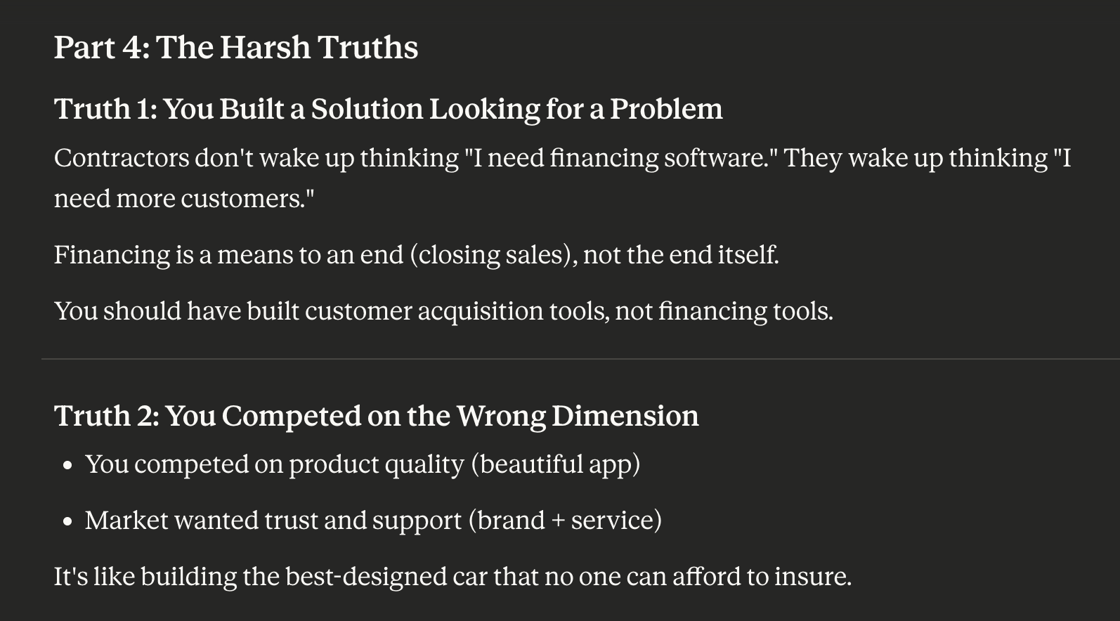"Your business model isn't broken. Your distribution channel is broken. You're building a service business disguised as SaaS. You're trying to serve customers who don't want what you're selling, but your product and IP work. You just need the right audience.